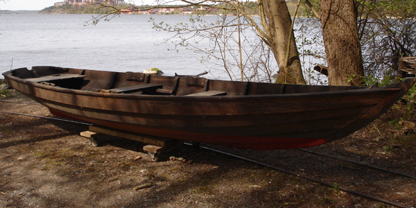 Byggår 1928, Hildor Hedelin, Svartsö. Material och färger: Furubåt med köl och basade spant i ek. Ut- och