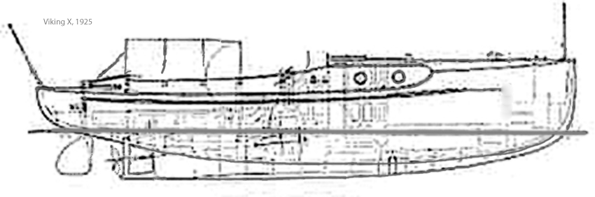 ”Viking X” enligt skissen nedan konstruerades av den kände C G Pettersson. Den mäter 9 x 2,17 meter och gjorde högst 7 knop med en 8-10 hästkrafter Penta inombordsmotor. Med denna båt gjordes en långfärd runt Skandinavien. Man startade från Stockholm den 20 juli 1925 och kom åter den 3 november samma år. Färden gick över Falsterbo, Mölle, Oslo, Trondeim och Narvik. Båten gick därifrån på järnväg, sjösattes i Luleå och anlände slutligen till Stockholm.